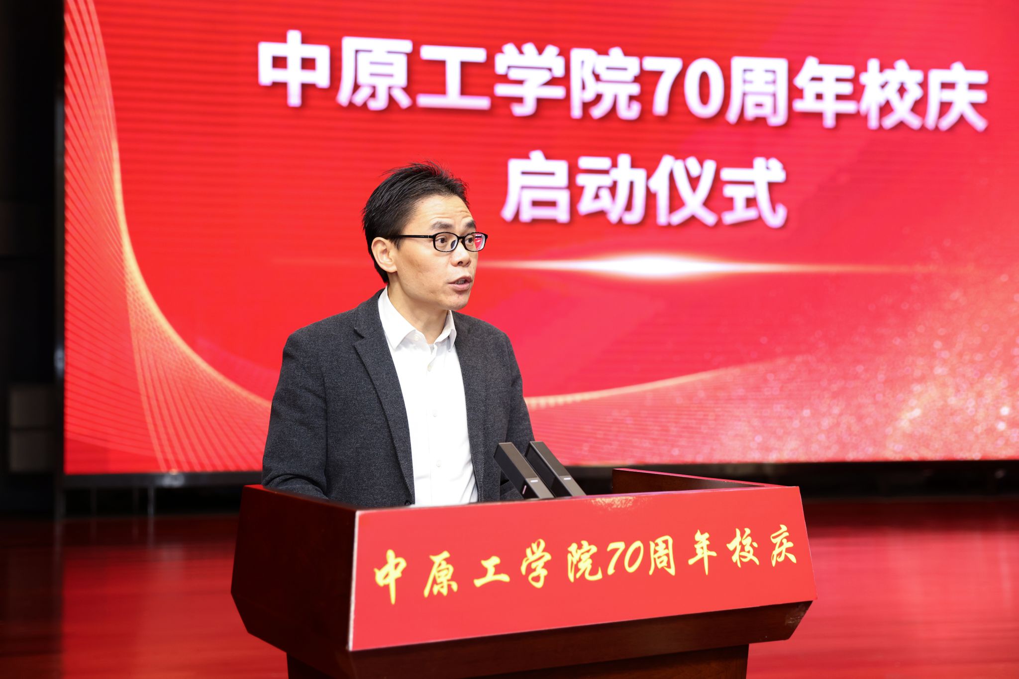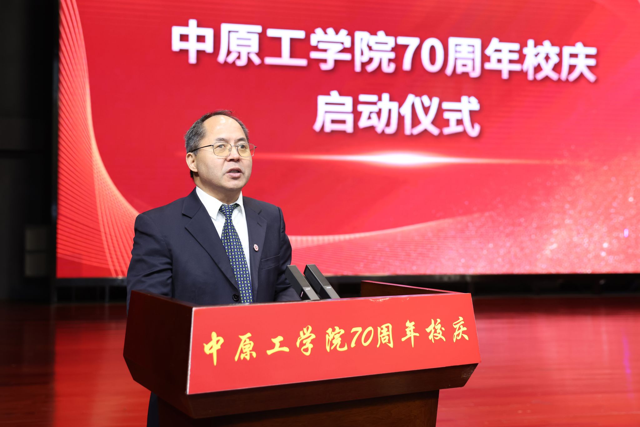 12月23日,学校70周年校庆300天倒计时启动仪式在龙湖校区举行。校领导贾少鑫、夏元清、宋晓炜、邹松涛、瞿博阳、张爱华、杨坤、马建国、张纪峰,原校党委书记吴法耇,纺机92级校友、恒天重工党委副书记、总经理吕宏斌,工业自动化97级校友、新开普电子股份有限公司副总裁杨文寿,热能05级校友、河南美的暖通与楼宇设备销售有限公司总经理郭华兵,会计97级校友、河南华瑾会计师事务所董事长田红战,校友代表、师生代表和全体中层干部齐聚三组团报告厅,共同见证建校70周年校庆300天倒计时启动。