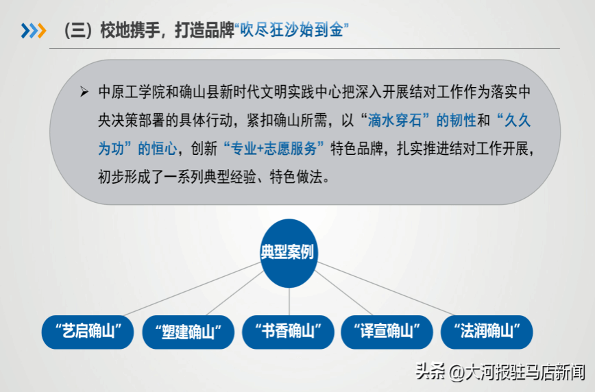 在交流展示环节,方敬永对学院概况进行了简要介绍,详细阐述了“校地结对”工作情况,在提及确山时,他热情洋溢地宣传推介了确山优美的人文资源、厚重的历史文化。他强调,学院始终围绕确山所需,积极开展调研交流,立足“双向奔赴”,在人才、智力、财力等方面不遗余力地予以帮扶共建,持续推动“艺启确山”“塑建确山”“书香确山”“译宣确山”“法润确山”等一系列活动开展,得到了社会各界的广泛关注和高度认可。2024年以来,已被央广网、中国日报网、大河报等省级以上主流媒体报道50余次。
